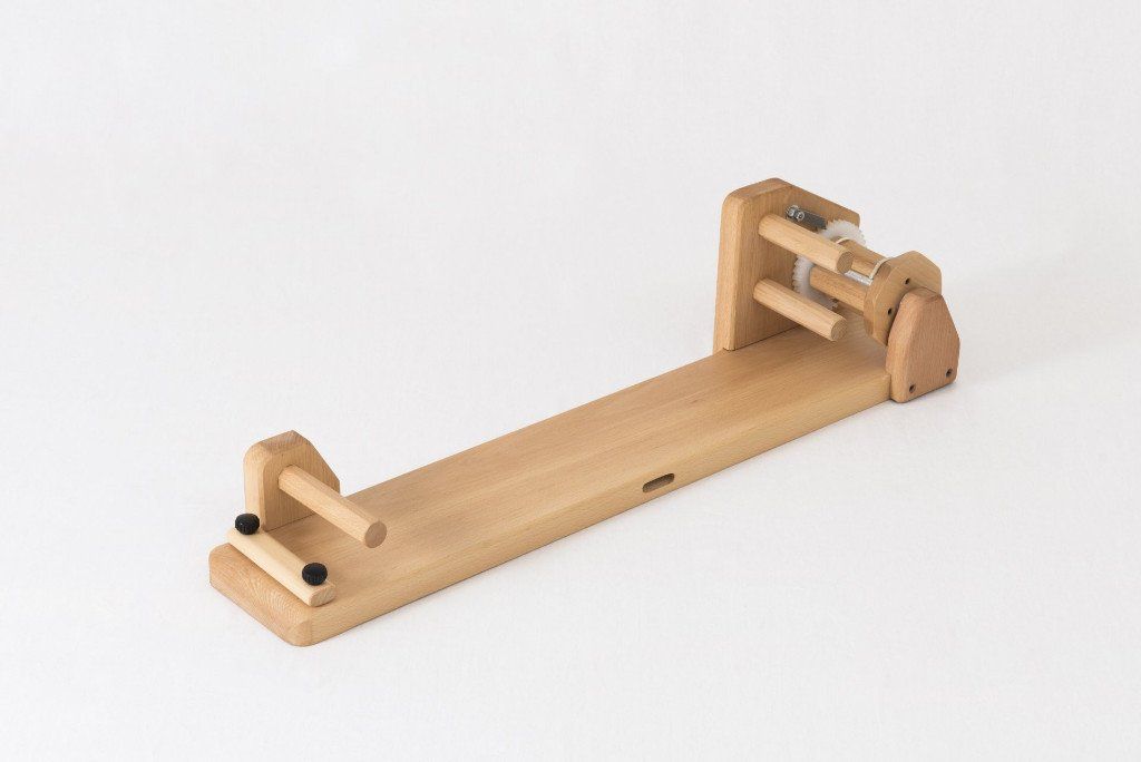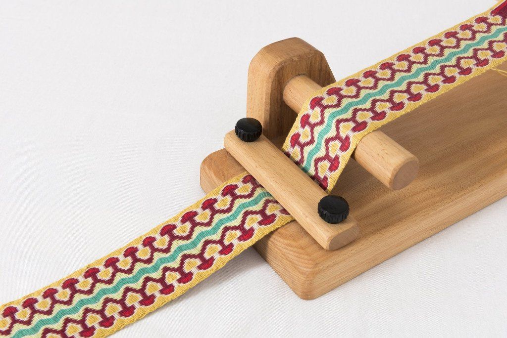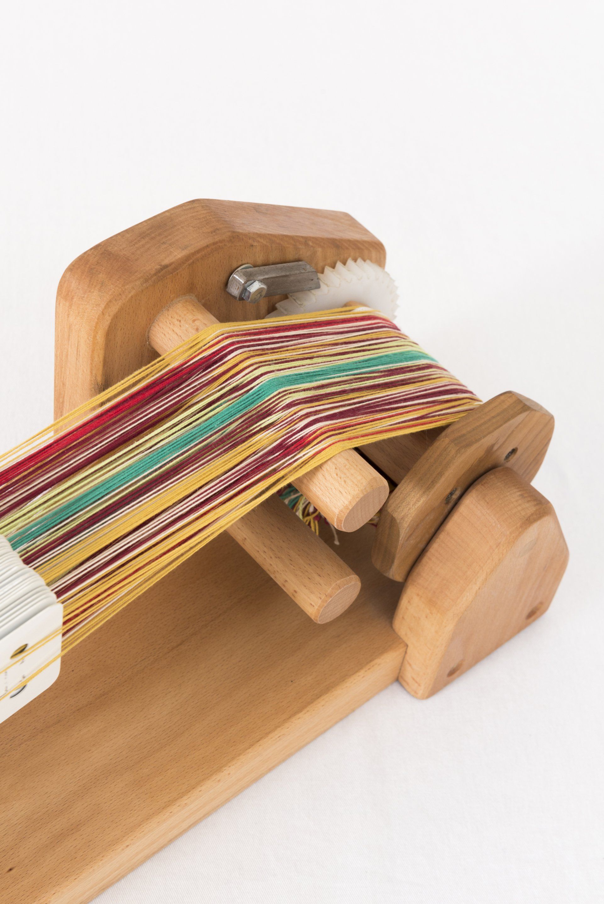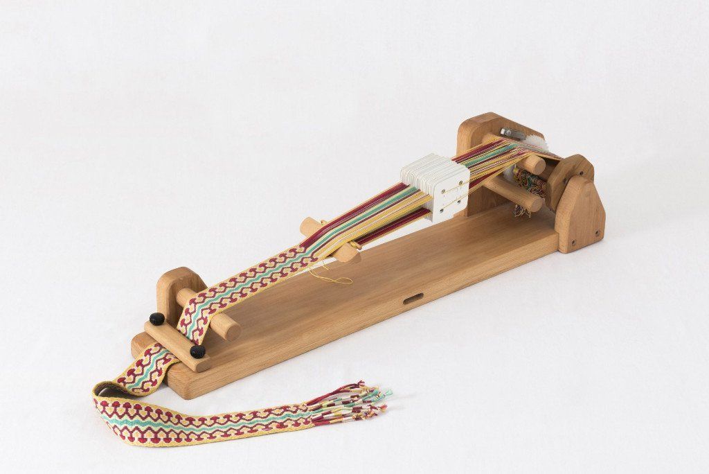Robust loom made of beech wood finished with vegetable oils and waxes with a warp beam and a chest clamp that enables the finished cloth to be cut while advancing with the work. The brake system is a toothed wheel with bevel. It can hold a maximum of 70 PVC cards.
