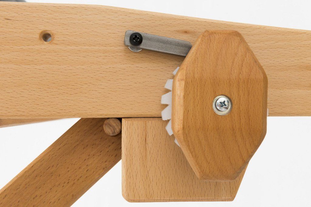 In legno di faggio evaporato, finito con cere e oli vegetali. L’avanzamento del tessuto è per avvolgimento agevolato da pratici volani in legno. Il sistema a freno è a ruota dentata con saltarello. I subbi sono ottagonali in legno massello dal diametro di 4,5 cm. Le traverse e i fianchi del telaio hanno tra loro una giunzione ad incastro e tassello a vite, i fianchi hanno un incastro tenone-mortasa e chiodo di legno.