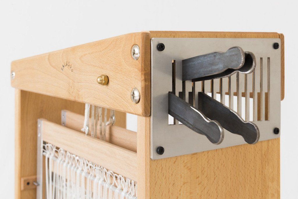 Realizzato in legno di faggio massello evaporato viene finito con una soluzione di cere e oli vegetali. Predisposto per portare fino a dodici licci, il passo d’ordito si forma per alzata e le maglie dei licci sono in nylon cm 18. I quadri sono solidi in legno e alluminio. L’avanzamento del tessuto è per avvolgimento agevolato da pratici volani in legno. Il sistema a freno è a ruota dentata con saltarello. I subbi sono ottagonali in legno massello dal diametro di 4 cm. Il pettorale, le traverse di sostegno e i fianchi del telaio hanno tra loro una giunzione ad incastro e tassello a vite; i fianchi hanno un incastro tenone-mortasa e chiodo di legno.